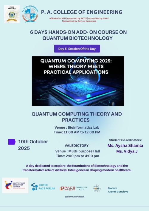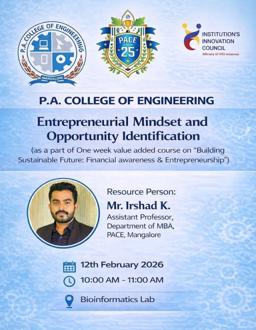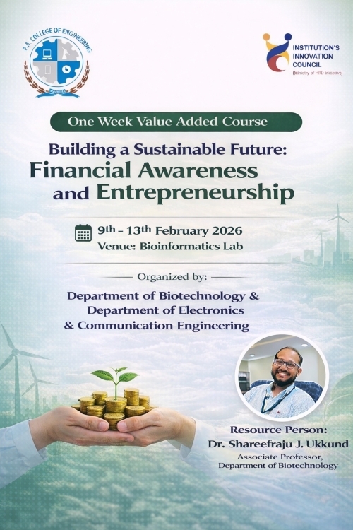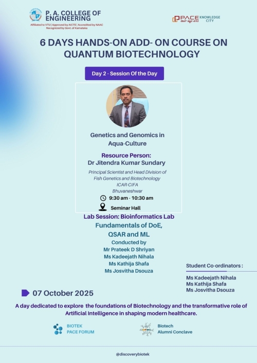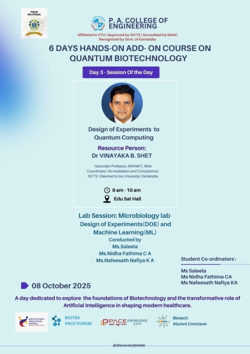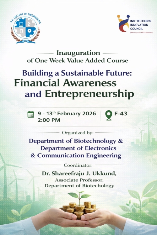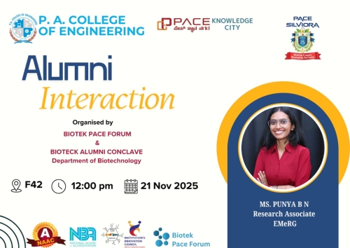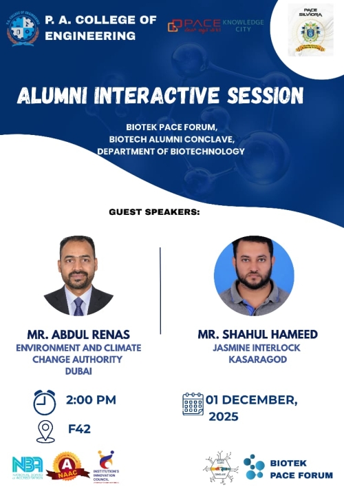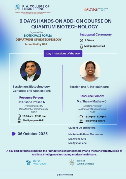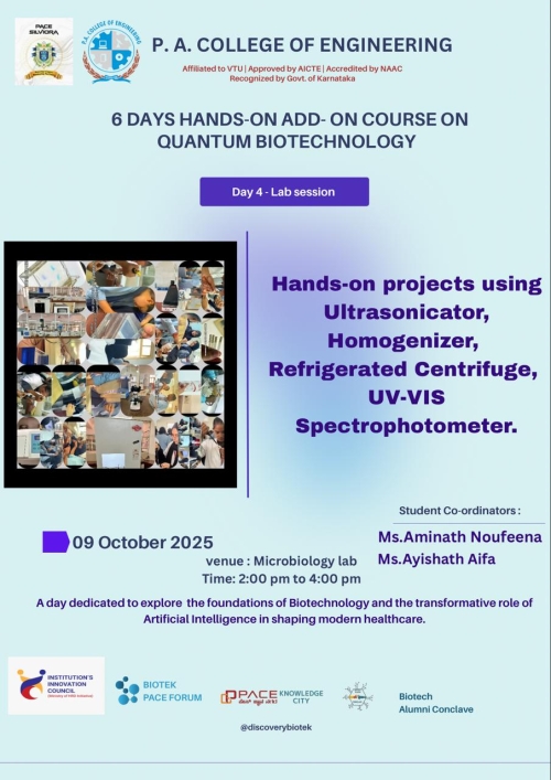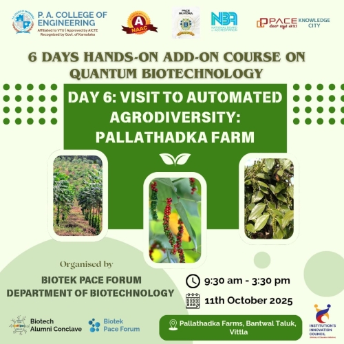 Department of Biotechnology at P. A. College of Engineering established in the year 2002, conducts four years B. E. in Biotechnology programme under Visvesvaraya Technological University (VTU), Belgum. The department since its inception reached greater heights while catering the need of the society and industry. Salient feature of the department is as follows.