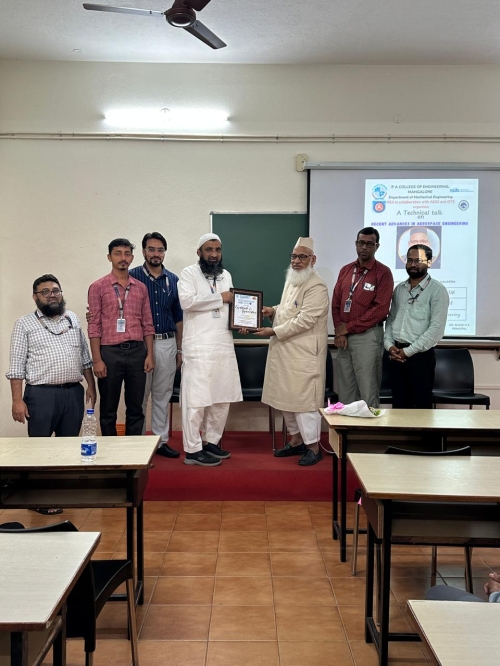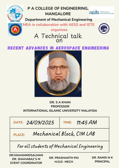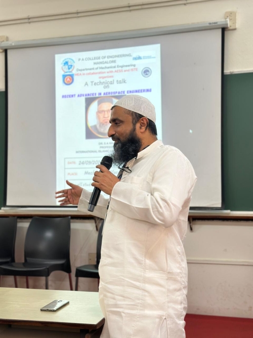 On February 3rd, a renowned personality and former Principal Dr. S.A. Khan visited P.A. College of Engineering, Mangalore to deliver an Invited Talk on “Recent Advancements In Defence and Space Resources”. Dr. S.A. Khan who is currently a Professor at the International Islamic University Malaysia (IIUM), Kuala Lampur has also worked in Defence Research And Development Organisation (DRDO). During his seminar, he threw a limelight on concept of micro-jets to control the base pressure and jet noise, missile modifications for enhanced performance, unguided rockets etc. Dr. Khan also gave a brief overview of his contribution to the DRDO such as the alterations he made in the missile and rocket to adapt longer trajectories. At the end, he talked about his ongoing research at IIUM, and developments being made with the rise in modern era of science and technology. The programme was then followed by Principal Dr. Abdul Sharief‘s speech. He thanked Dr. Khan for giving his valuable time out of his busy schedule and parting with his great knowledge. The Director of Academics Prof. SurfrazHashim, Dean Research Dr. Zahid Ansari also gave their concluding remarks. The Vice Principal & HOD of Mechanical Department Dr. Ramis M.K. finally thanked the esteemed guest for sparing his time and knowledge for the sake of students present over there.