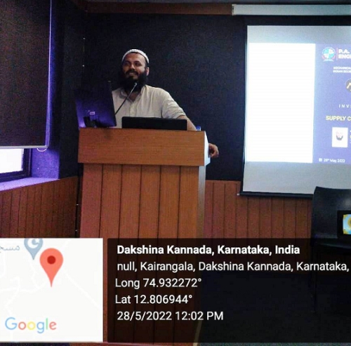 An invited talk on ‘NextGen Supply Chain Management’ by Prof. Mohammed Avvad, Department of Mechanical Engineering, PACE, Mangalore, was organized on 28th May, 2022. Prof. Avvad explained the basic concepts of supply chain management (SCM) and also gave an overview of NextGen supply chain management. He informed the students to carry out research work by integrating SCM with the latest technology developments such as blockchain, IoT, Artificial Intelligence, etc.