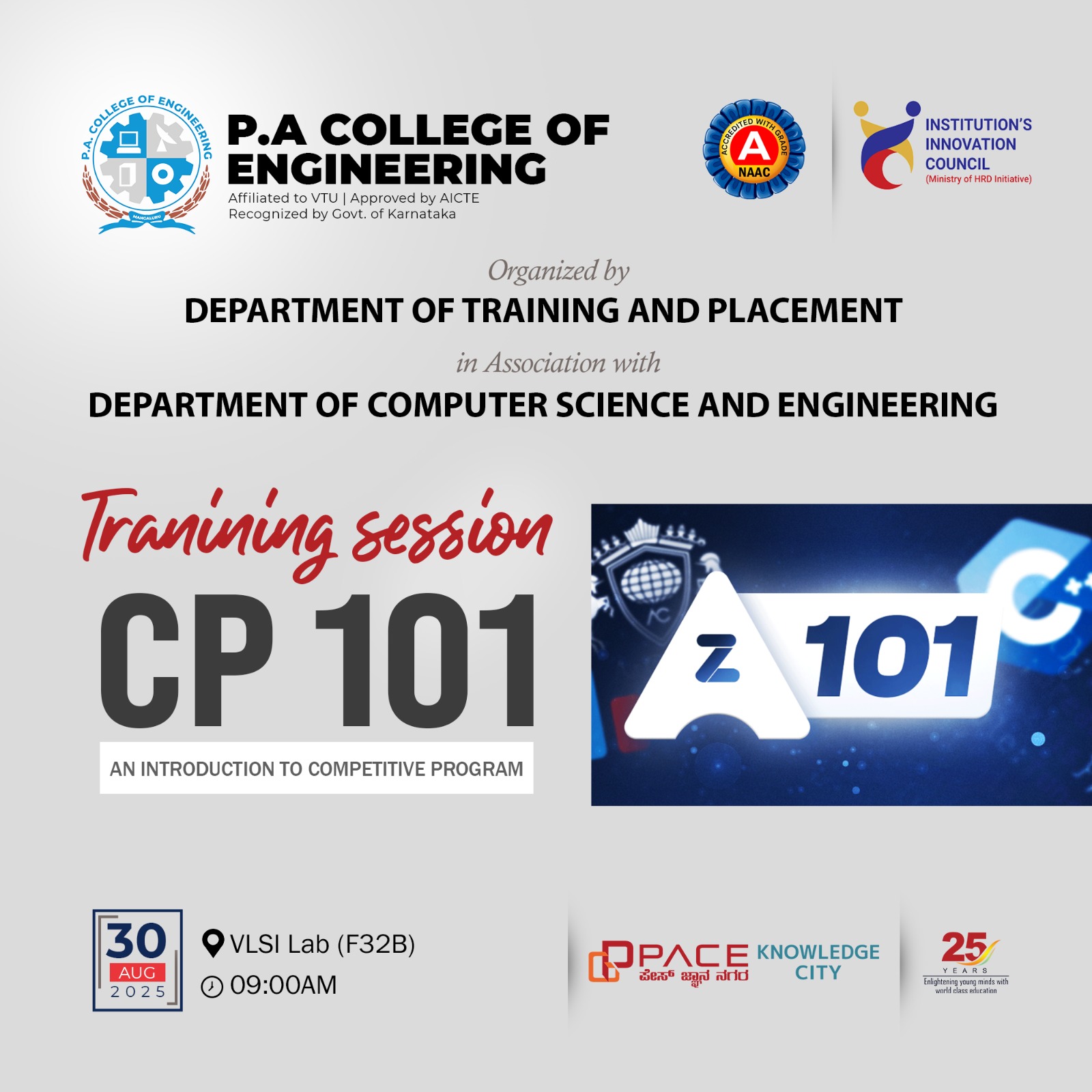 The Department of Training and Placement, in collaboration with the Computer Science and Engineering department, organized a session on Competitive Programming (CP 101) to introduce students to coding fundamentals and problem-solving on 30 th August, 2025.