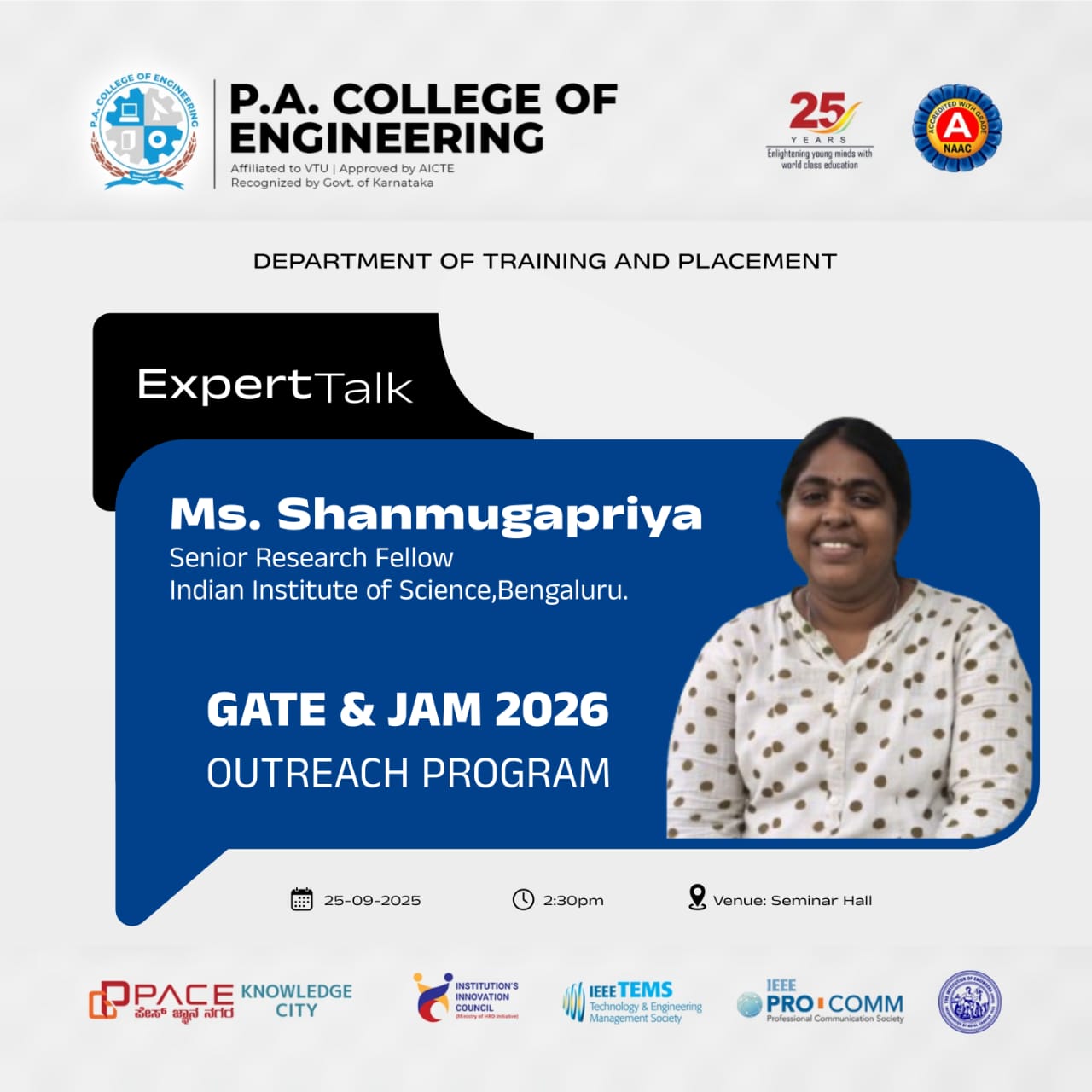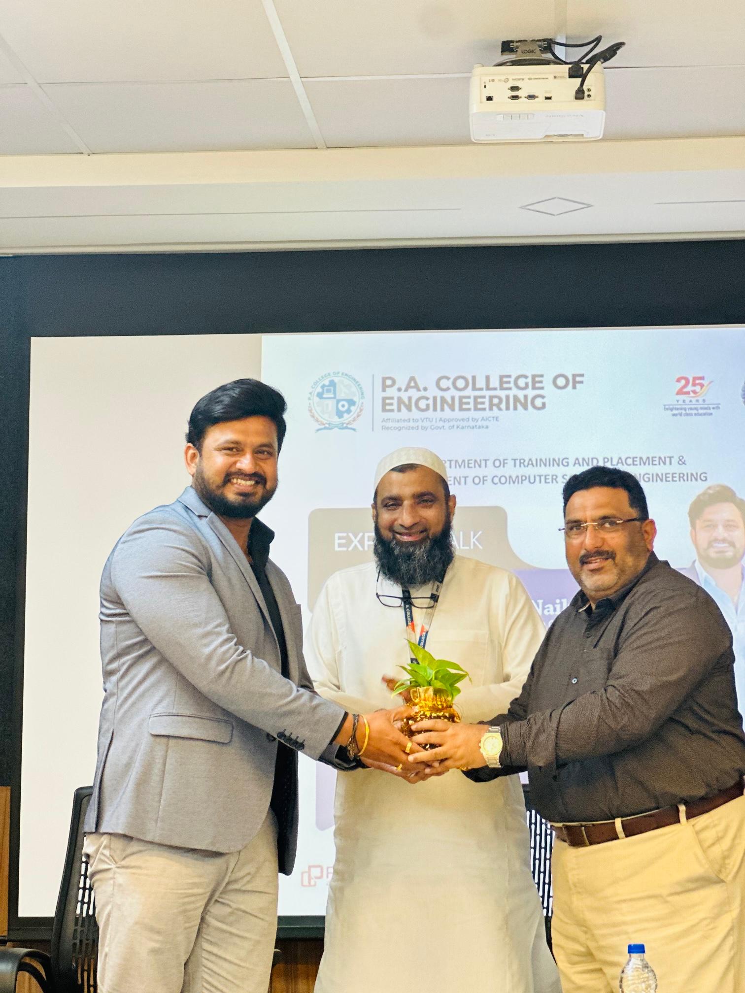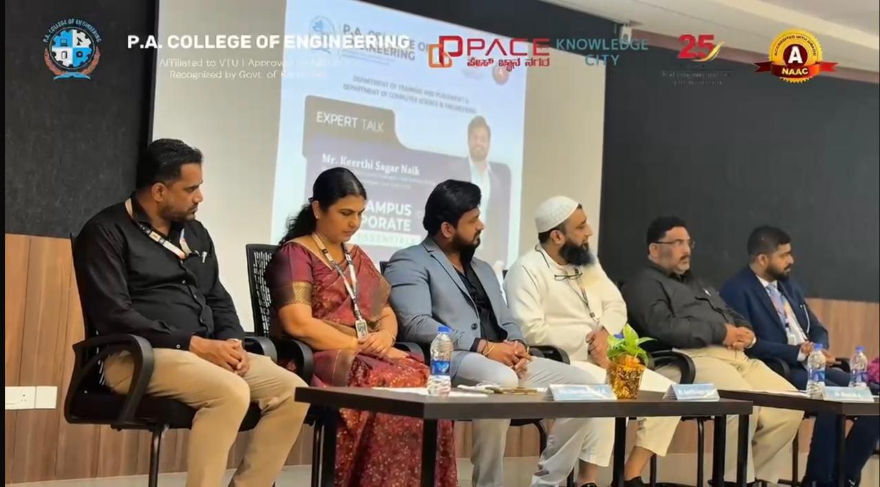 An expert talk on “GATE & JAM 2026 Outreach Program” was organized on 25th September 2025 by the Department of Training and Placement, P.A. College of Engineering, for selected third- and fourth-year students from all engineering branches.