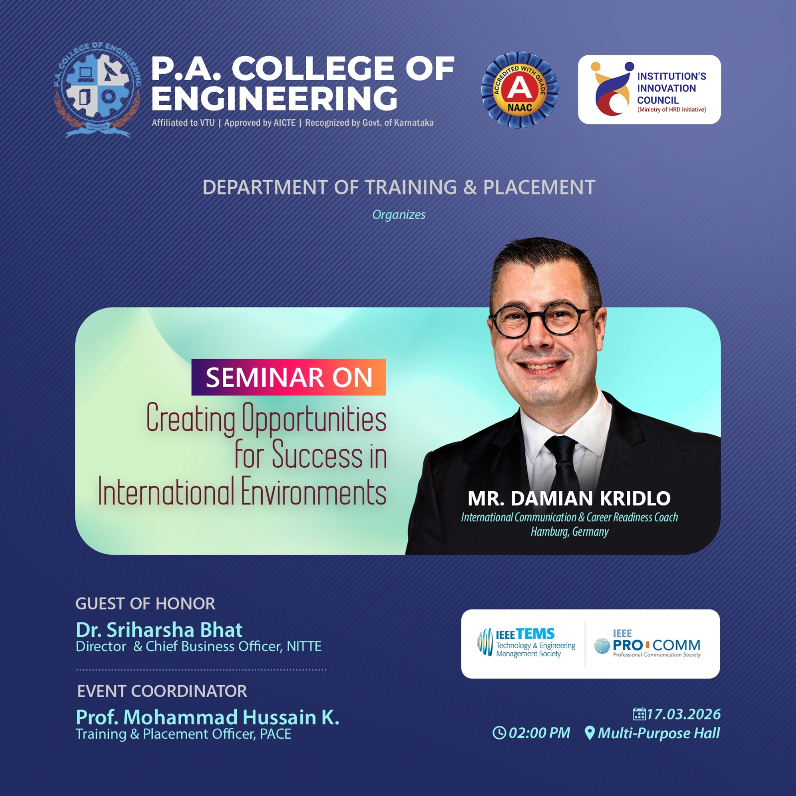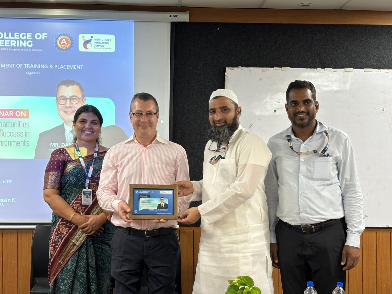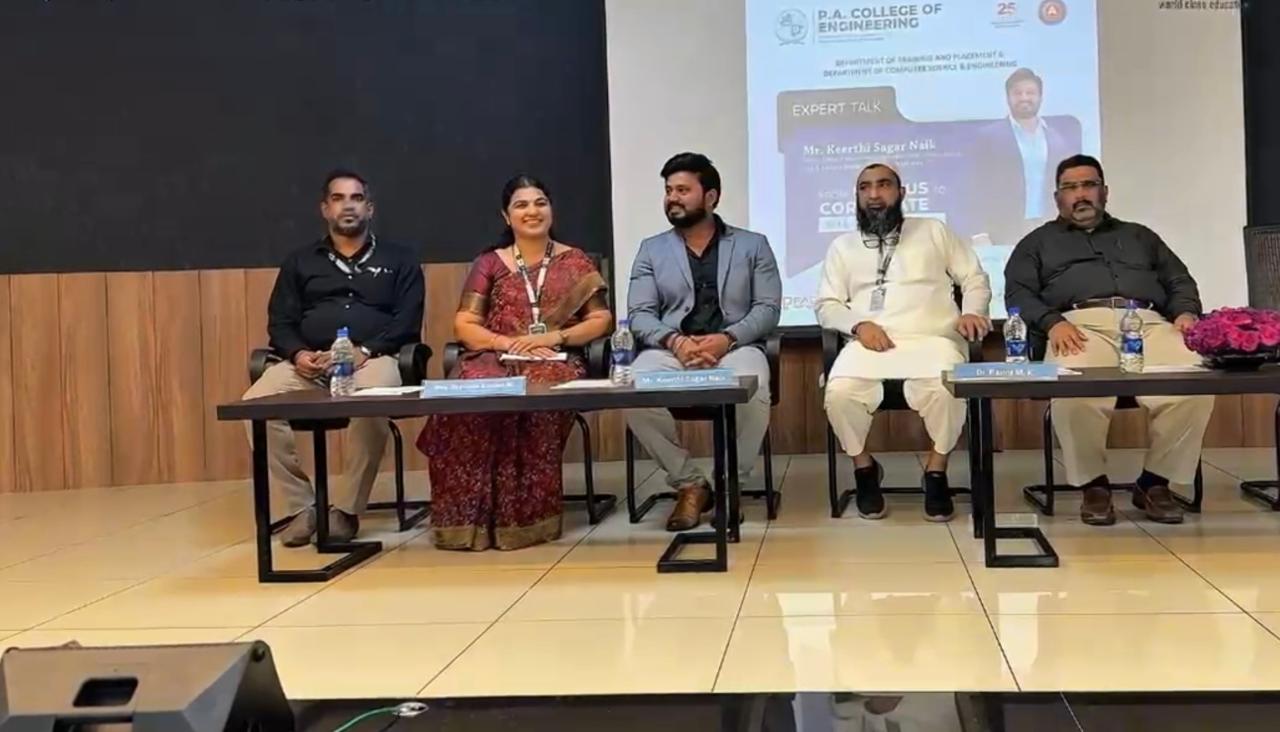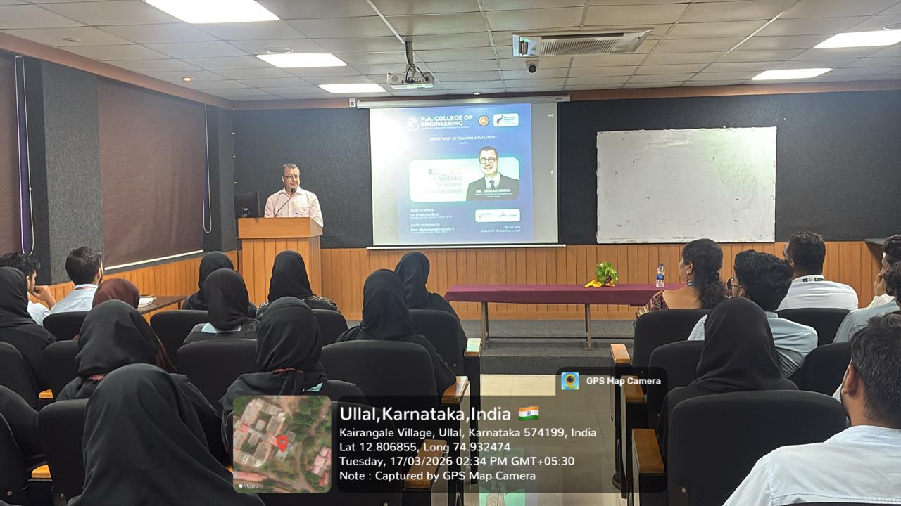 P.A. College of Engineering, Mangaluru, continues to strengthen its global outlook through impactful academic initiatives. The Training and Placement Department organized a dynamic session on “Creating Opportunities for Success in International Environments” on 17-03-2026 at the Multipurpose Hall, aimed at equipping students with the skills required to excel in a global professional landscape.
