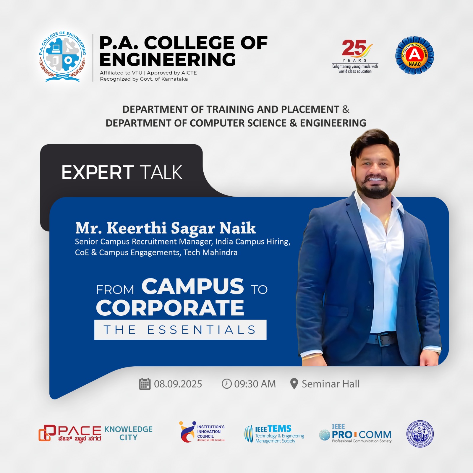 An enlightening expert talk on “From Campus to Corporate” was organized on 8 th September by the Department of Computer Science & Engineering in association with the Department of Placement and Training for the final year students. The resource person, Mr. Keerthi Sagar Naik, Senior Campus Recruitment manager, India Campus Hiring, CoE & Campus Engagements, Tech Mahindra shared inspiring anecdotes from his personal journey, emphasizing the importance of identifying and working on one’s drawbacks, healthy networking, consistently up skilling, toning down attitude, and always wearing a smile to be corporate-ready.