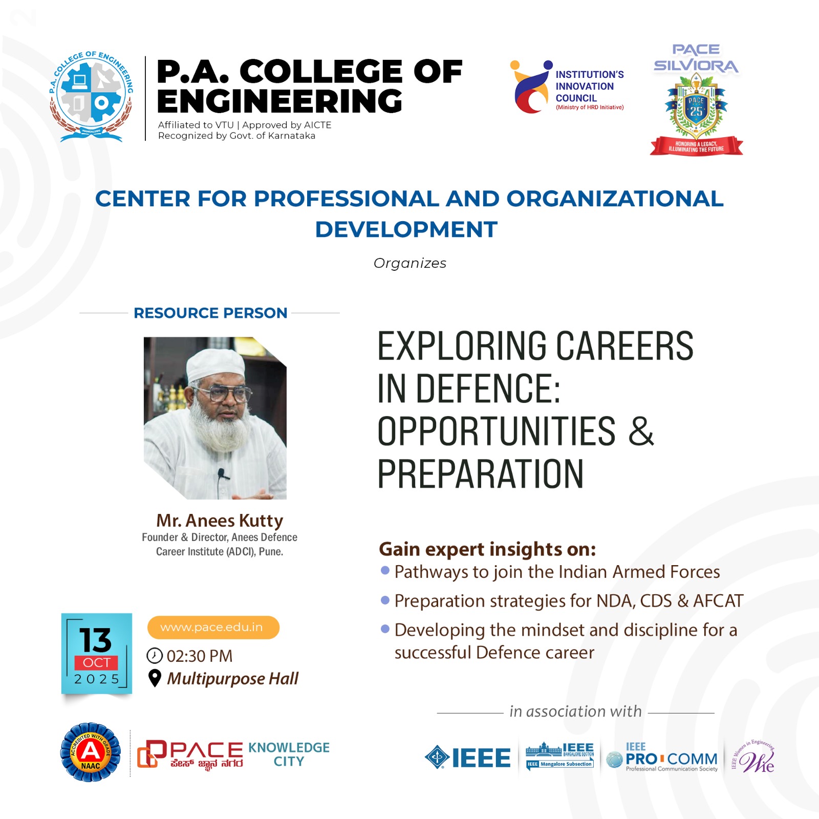 ESP Course DetailsOn October 13, 2025, the Center for Professional and Organizational Development at PA College of Engineering hosted an insightful session on exploring careers in defense and preparation strategies. The resource persons were Mr. Anees Kutty, Founder Director of Anees Defense Career Institute, Pune, and Dr. Sadaf. The session, attended by first- and third-year students, provided valuable guidance on defense career opportunities, preparation techniques, and career pathways. Dr. Ramis M. K., Principal, also participated, emphasizing the session's significance. The interactive program inspired students to consider defense careers, offering practical insights and motivation to pursue these prestigious and rewarding opportunities.
