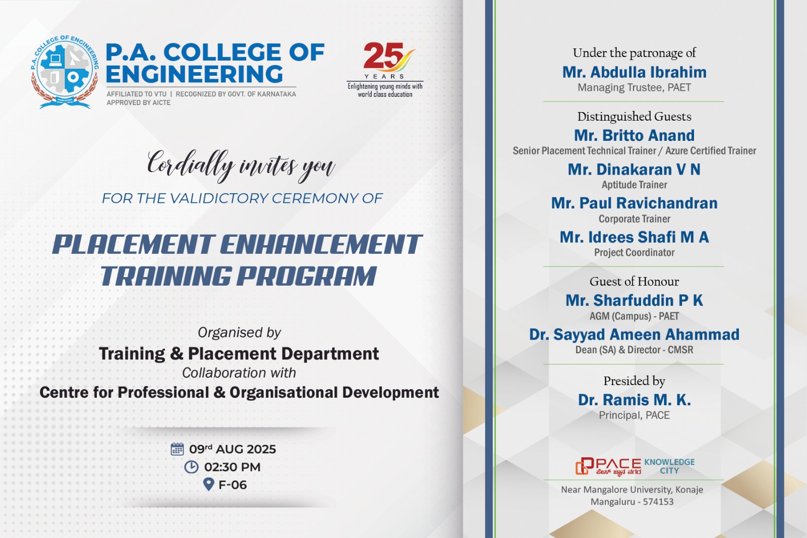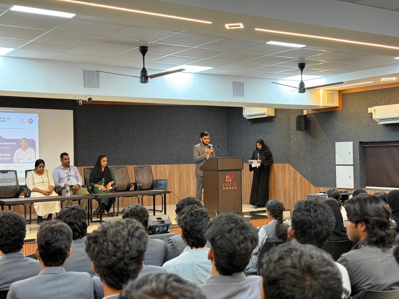 An Academic, Placement, Innovation and Internship Orientation Session was held on August 21, 2025, at the PACE campus, specifically curated for final-year students. The event aimed to provide comprehensive guidance on academic progression, placement preparation, and internship opportunities. It was organized by the Training and Placement Department and efficiently coordinated by Mr. Mohammad Hussain K and Ms. Hanan Hameed.