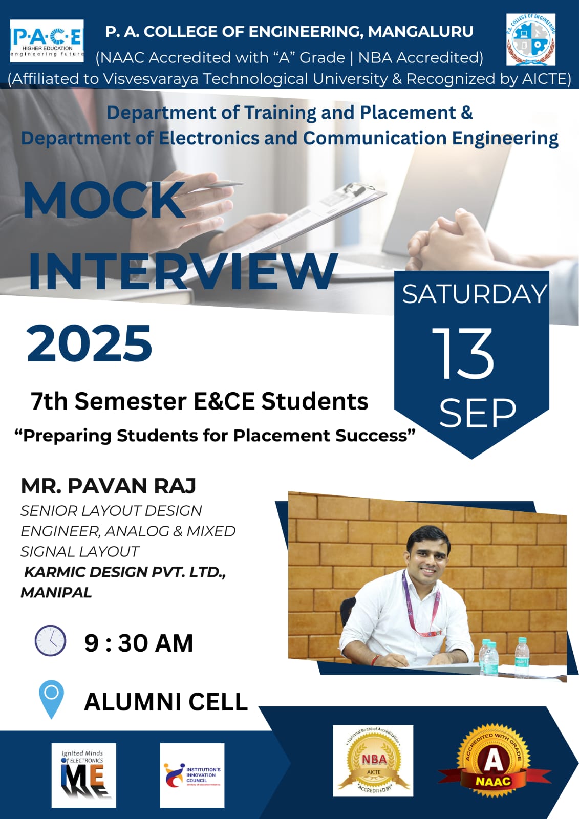 A Mock Interview session was organized on 13th September 2025 at 9:30 AM in the Alumni Cell of P.A. College of Engineering, Mangaluru, under the joint initiative of the Department of Training and Placement and the Department of Electronics and Communication Engineering for the 7th Semester ECE students. A total of 28 students participated, who were shortlisted on the basis of their academic CGPA and performance in the Technical Mock Test conducted on 13 th September 2025.
