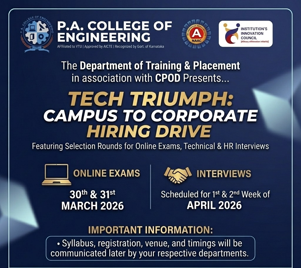 The Training and Placement Department of P. A. College of Engineering (PACE), Mangaluru, in association with Seventh Sense Talent Solutions, successfully conducted a computer-based mock test for all final-year students on 11-09-2025. The test was organized in two sessions – from 9:30 AM to 11:30 AM for Batch 1 and Batch 2 comprising CSE and AI & ML students, and from 10:30 AM to 12:30 PM for Batch 3 comprising ME, ECE, BT, and Civil students in the computer laboratories.