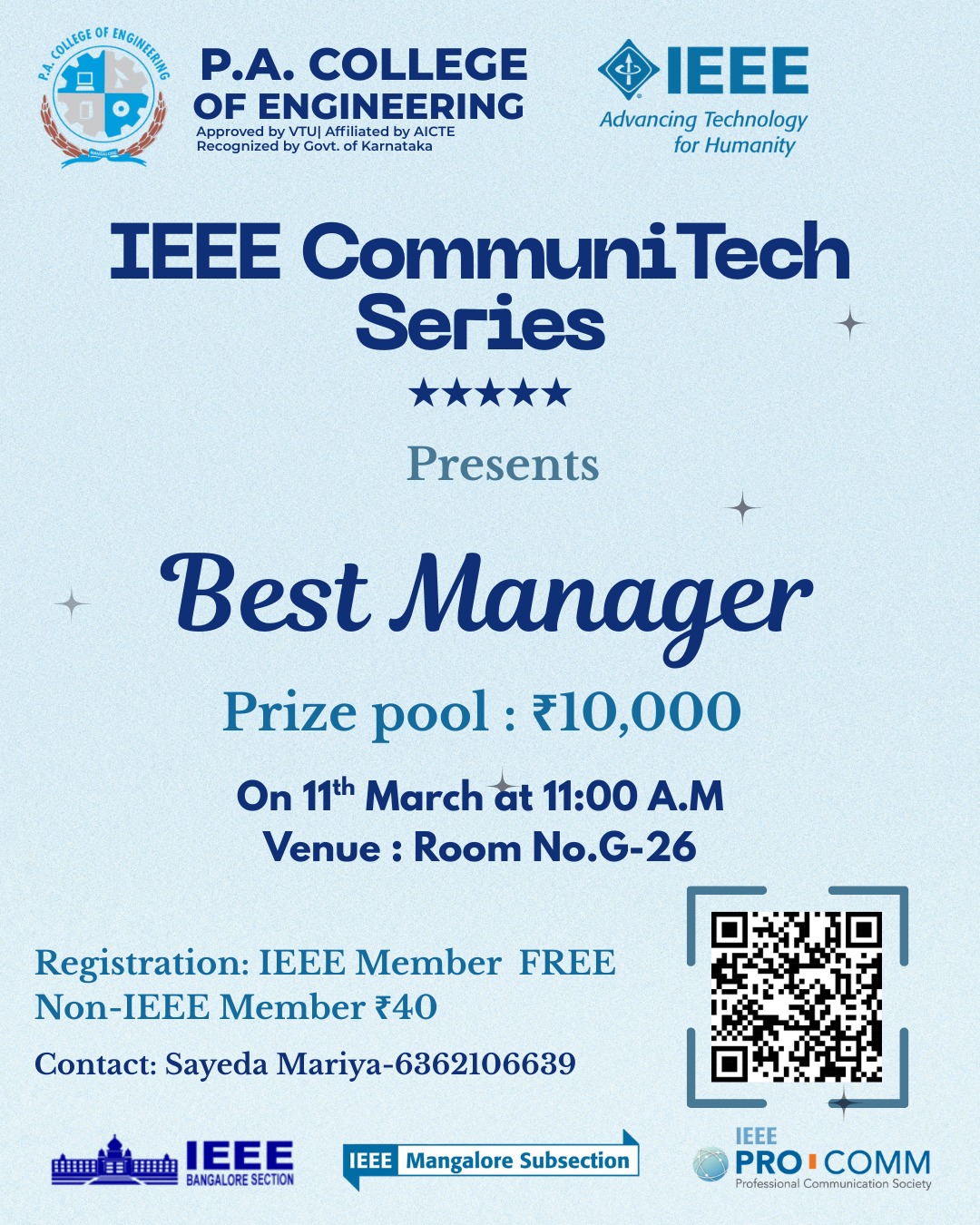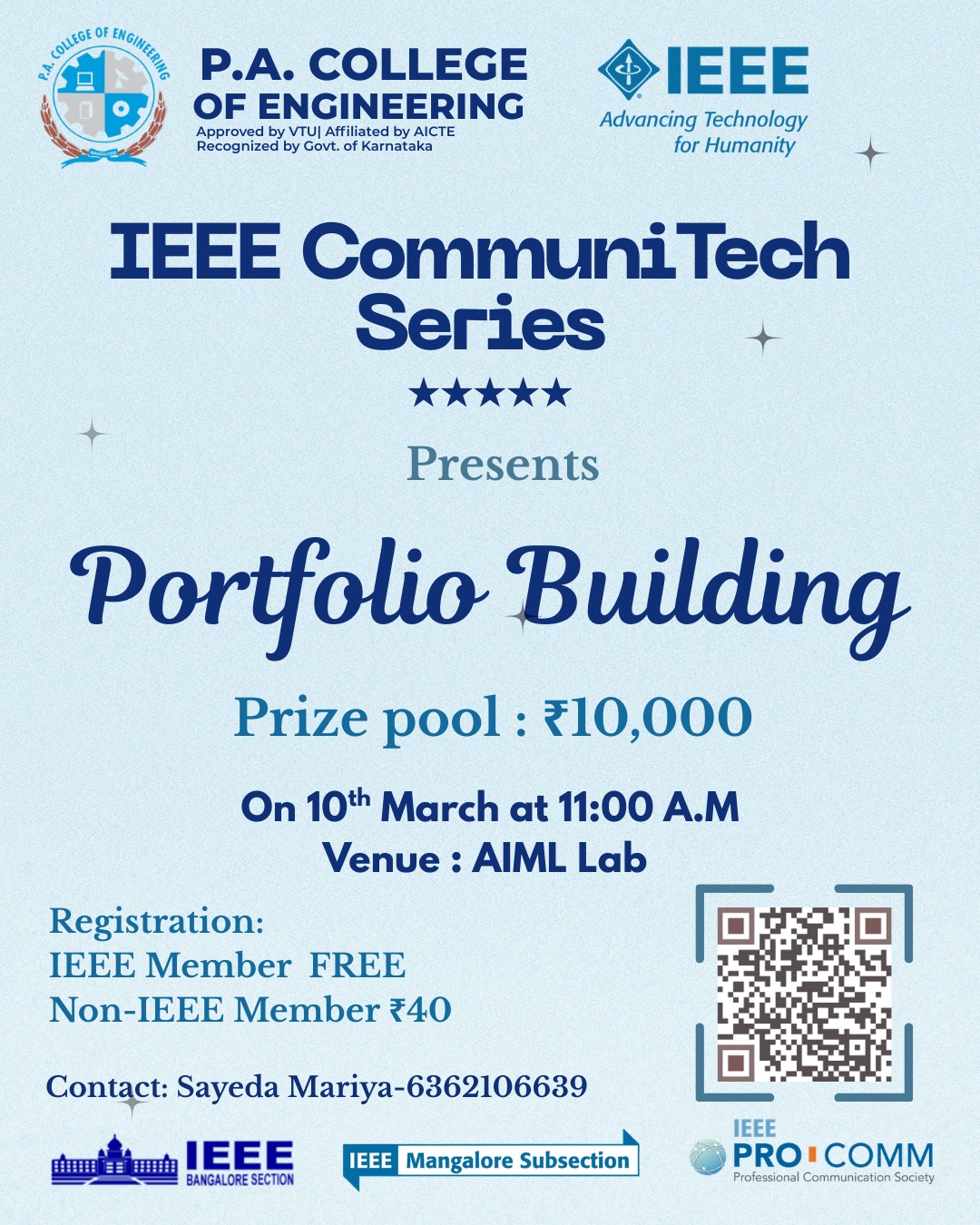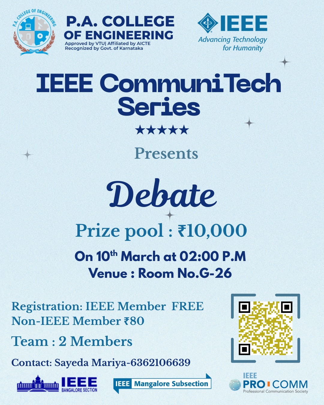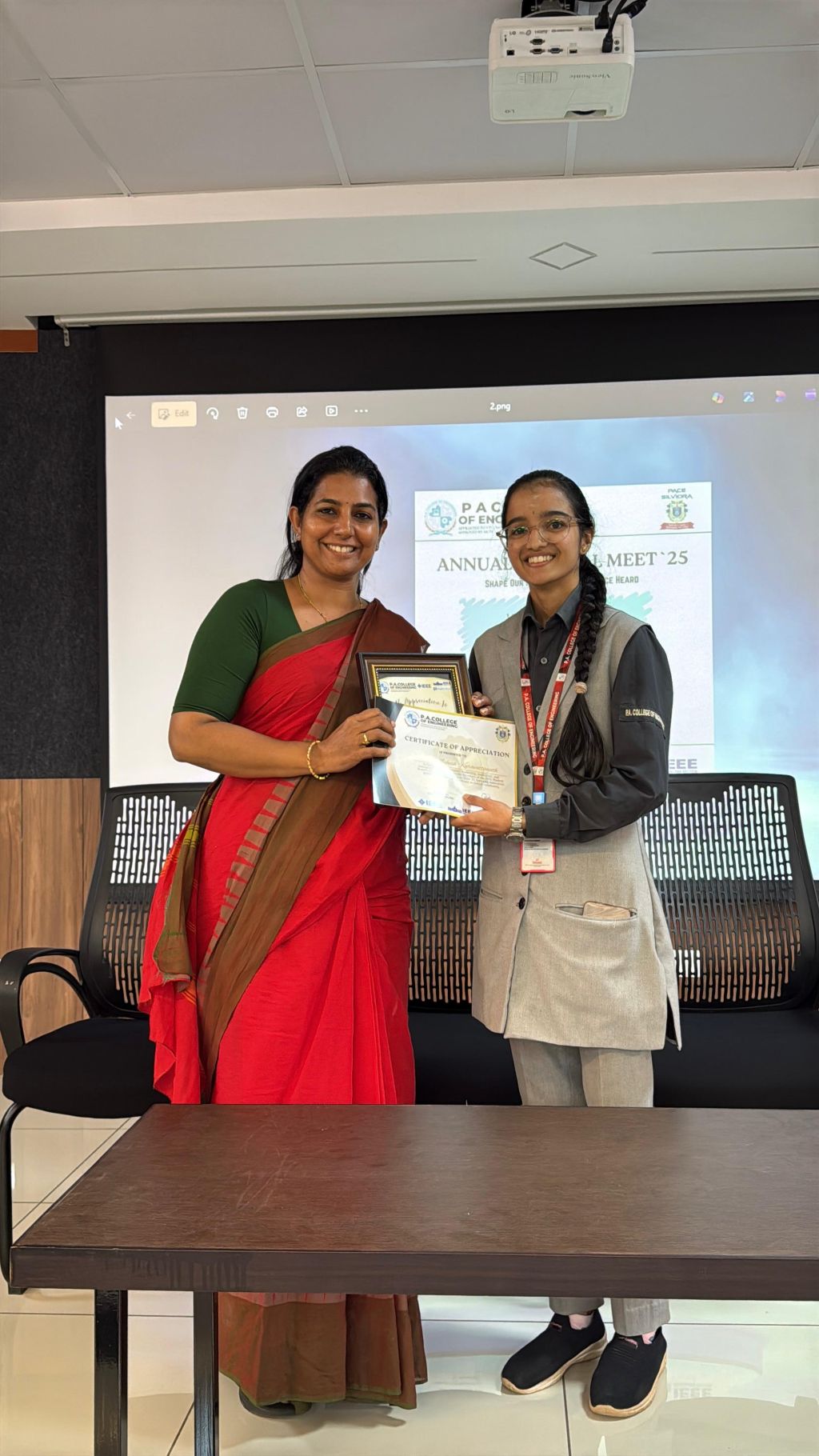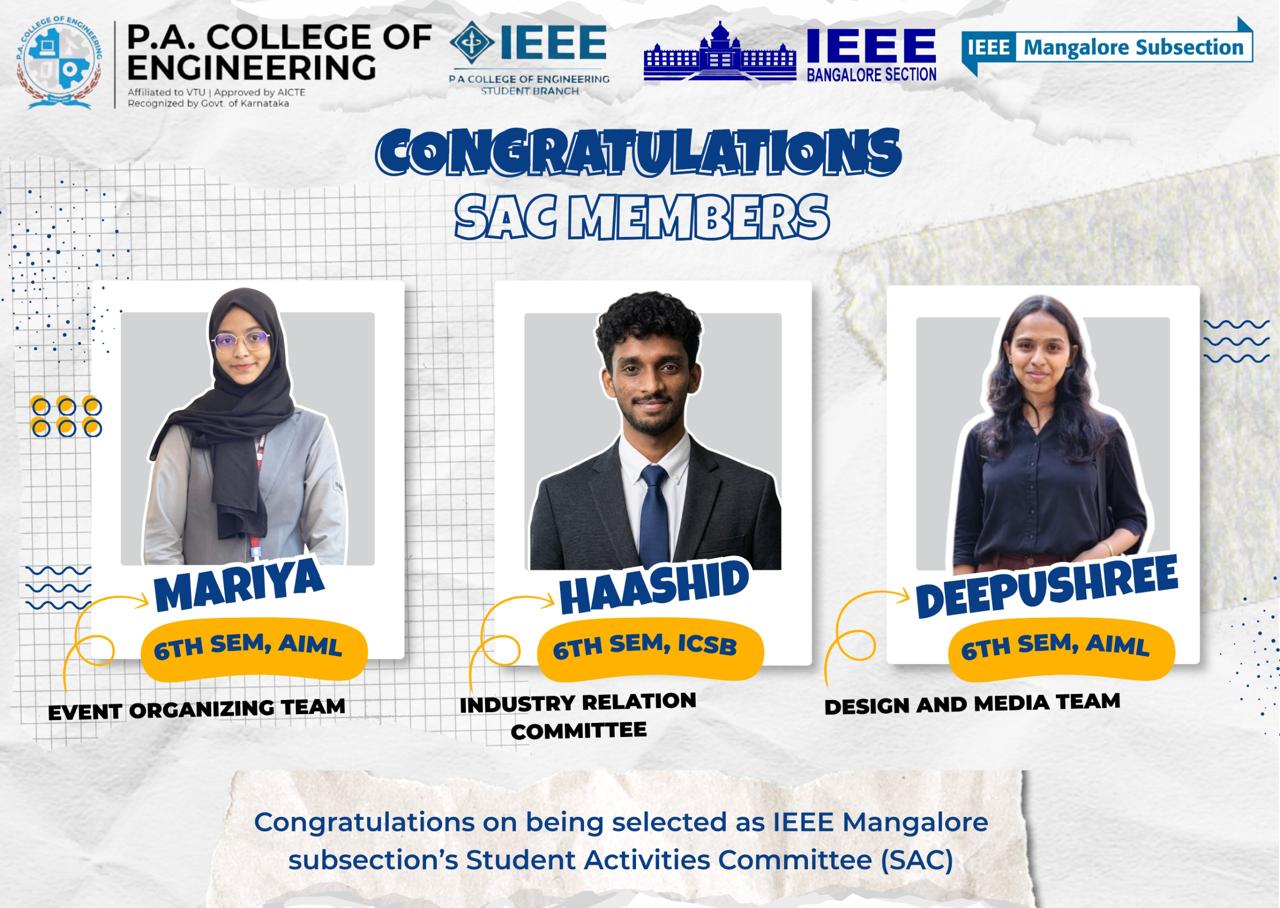 Ms. Rifah Sameen Sarang, 2nd year CS student from P. A. College of Engineering was selected out of 5 students that were selected from the IEEE Mangalore subsection for the first edition of the IEEE Bangalore Section Student Scholarship