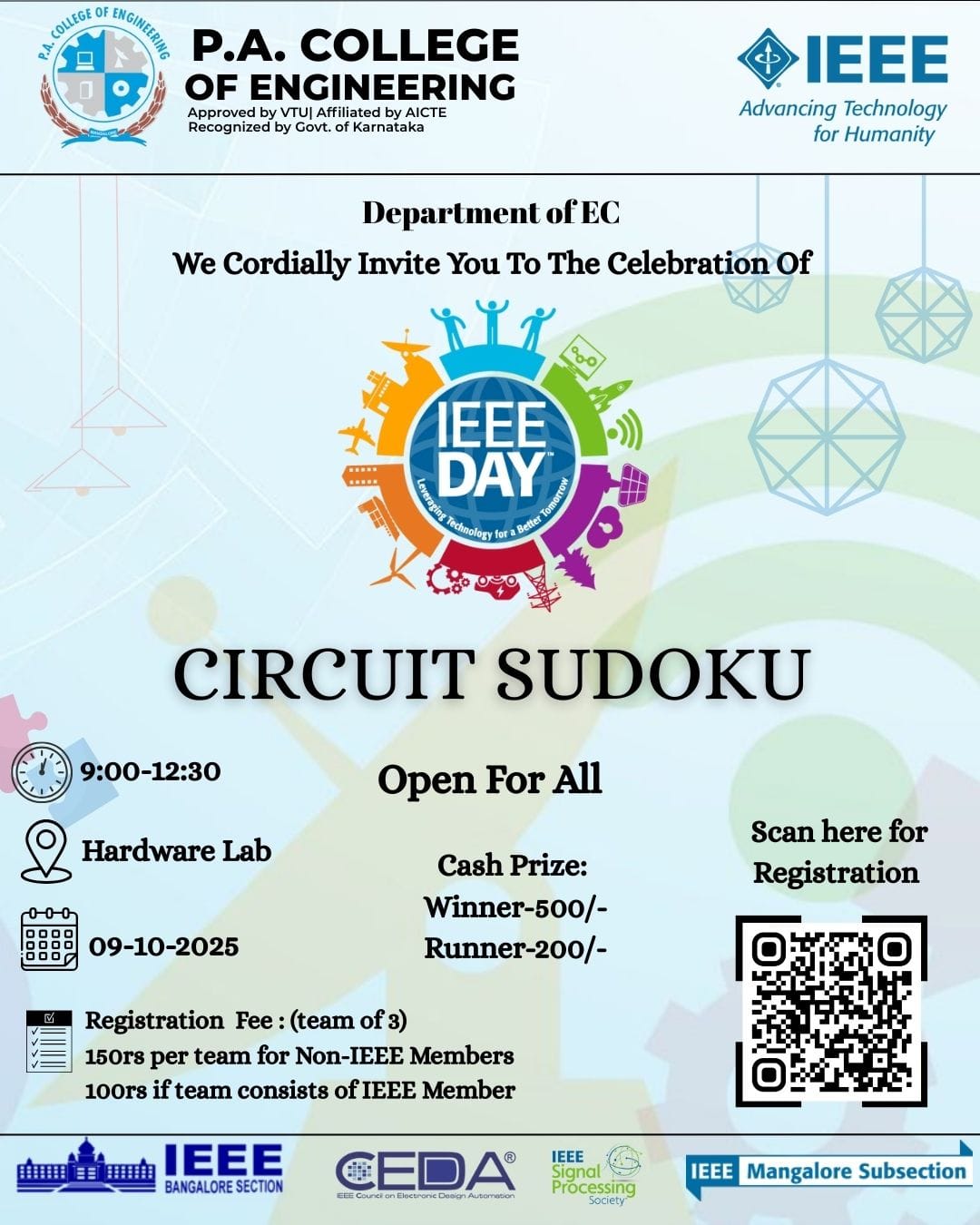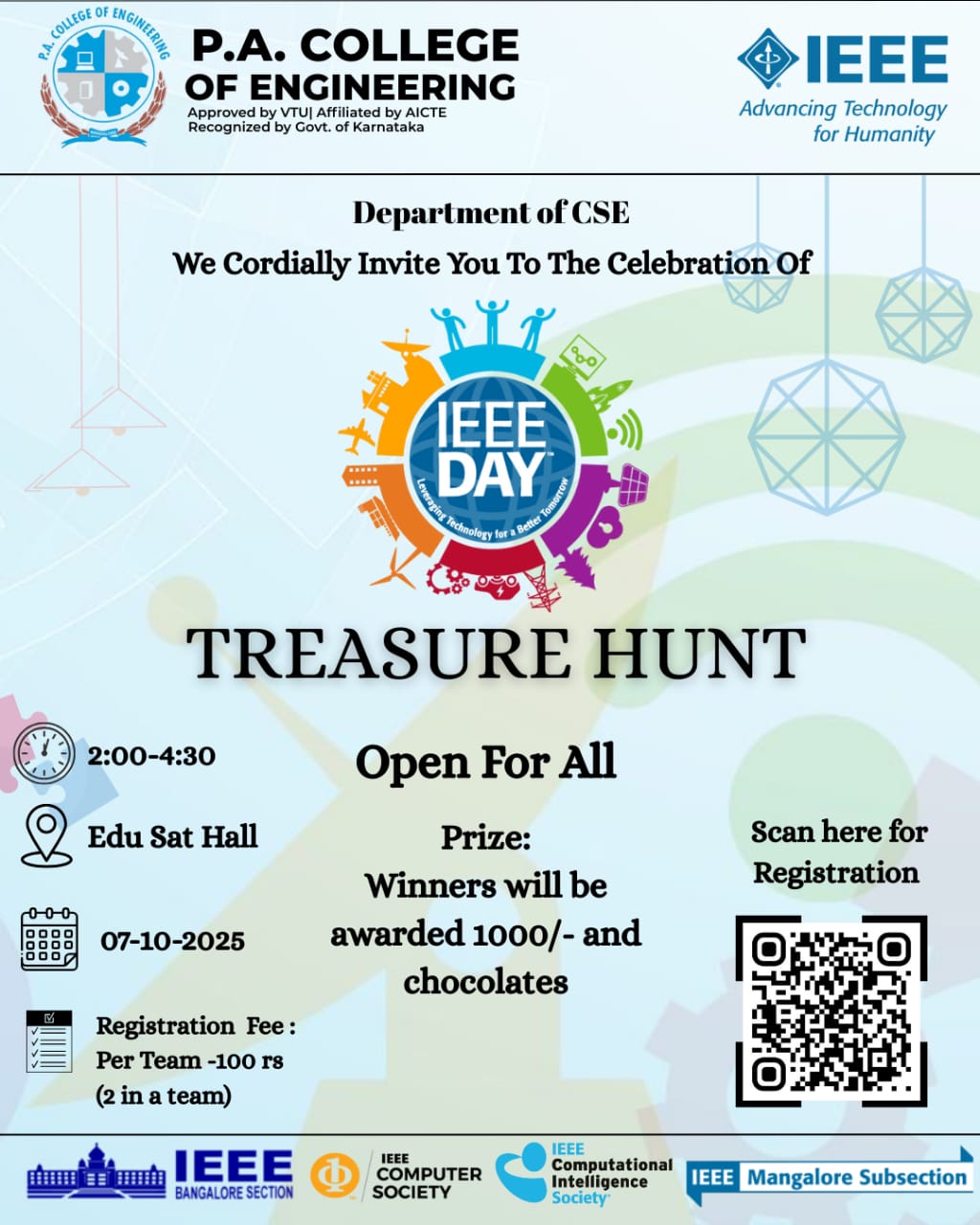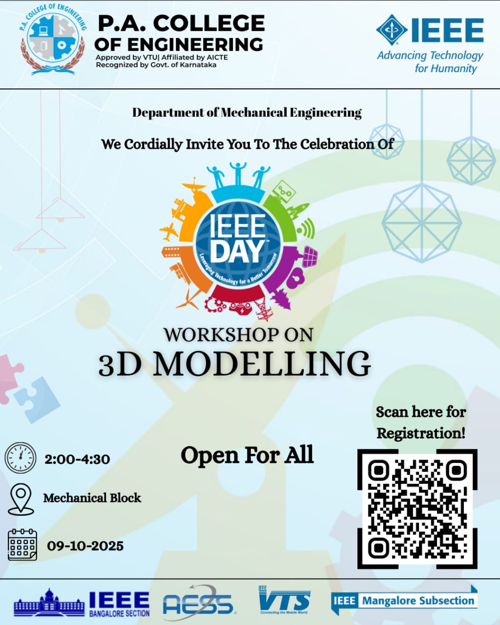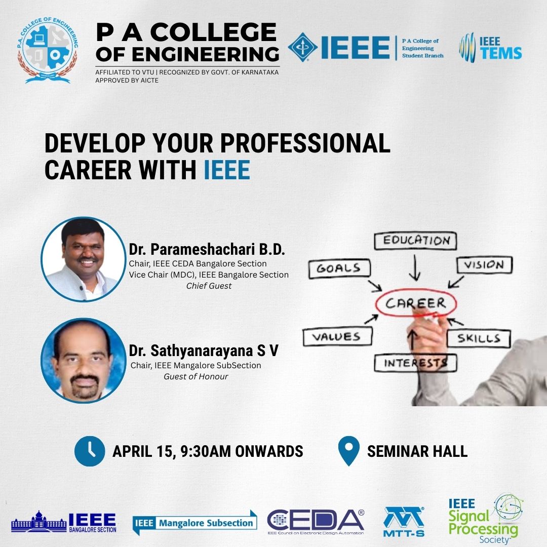 On 15th September 2023, a commemorative event was held at P. A. College of Engineering, to honour the legacy of Sir Mokshagundam Visvesvaraya, widely regarded as one of the most exceptional engineers in the history. This occasion marked the celebration of "Engineers Day" and was meticulously organized by the ISTE (Indian Society for Technical Education) and IEI (The Institute of Engineers, India) in collaboration with IEEE (Institute of Electrical and Electronics Engineers).
