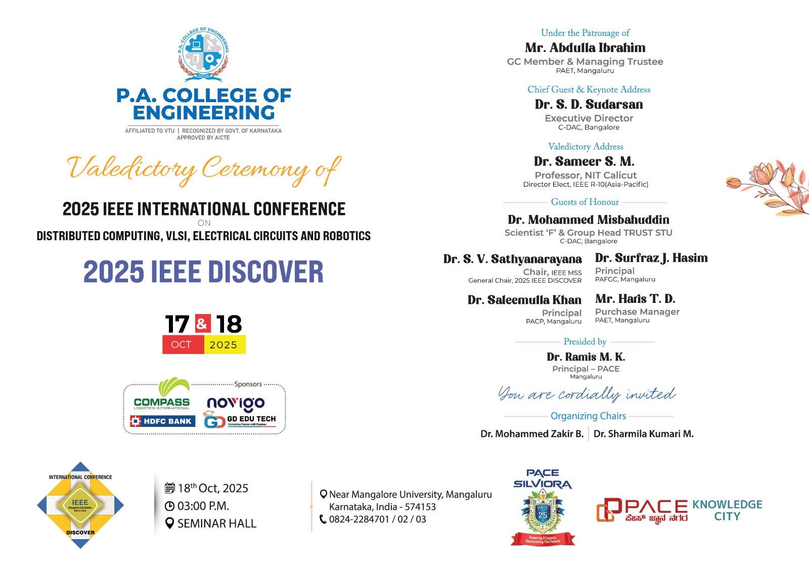 Dr. Mohit P.Tahiliani, Department of CSE, NITK Surathkal & Chair, IEEE Mangalore Subsection, and Chief Guest of PACE GRADUATION DAY 2023, interacted with the Key Officials of PACE KNOWLEDGE CITY. The session was chaired by Mr. Abdulla Ibrahim, the Managing Trustee, PAET. Mr. Mohit briefed about the various funding opportunities under IEEE and extended all his support for the upcoming Conferences at PACE, ICEST- 23, ICEST 24 (proposed) under the Technical Co Sponsorship of IEEE, and the DISCOVER 25 (proposed), the flagship conference under IEEE.